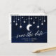 Céleste Enregistrer la date faire-part fiançailles carte postale. Script de calligraphie moderne. Aquarelle bleu nuit ciel avec les étoiles et la lune. Feux à cordes de Bokeh.