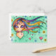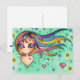 Carte postale avec un crayon coloré illustration traditionnelle d'une fille aux grands yeux violets flottant sur un arrière - plan vert turquoise. Ses beaux cheveux longs coulent à droite et sont faits de brins bleus, roses, violets et jaunes qui donnent l'impression d'un arc-en-ciel. Autour d'elle, il y a des étoiles et des coeurs éparpillés.