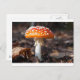 Classic Amanita Muscaria mushroom in the forest with leaves.