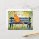 chat orange installé sur un banc de parc, entouré de verdure et d'arbres dans un cadre tranquille