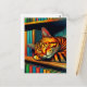 Chat de dessin animé de style bande dessinée dormant sur une étagère de livres. Une carte postale mignonne pour garder contact.