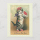 Très jolie image vintage d'un chat portant un bouquet de roses et une lettre scellée d'un rose. Elle a un ruban violet autour du cou, une couronne de roses sur la tête et porte de minuscules pantoufles roses.