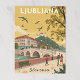 Ljubljana, avec l'emblématique pont Triple, les cafés riverains et le château de Ljubljana en arrière - plan. Ajoutez des gens qui marchent, des oiseaux qui volent et des arbres avec du feuillage graphique. Utilisez des jaunes moelleux, des verts d'oliviers et des roses saumons pour un look nostalgique. Texte : "LJUBLJANA" en haut en casquette blanc, "SLOVÉNIE" en texte mince ci-dessous.