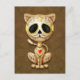Cette adorable chatte marron est décorée de tourbillons et de motifs à points. Des pédales de fleurs jaunes entourent les yeux noirs purs dans la tradition du Jour des crânes de sucre morts. Le chat est assis, regardant vers l'avant avec sa queue agitant dans l'arrière - plan. La tête surdimensionnée est assise sur un corps minuscule qui crée un dessin humoristique ludique comme l'apparence. Une étoile à cinq points se trouve au milieu du front du chaton, tandis qu’un coeur rouge et jaune vif apparaît au centre de la poitrine. Ce mignon petit chat est un design amusant et élégant inspiré par les beaux motifs du jour des crânes de sucre morts.