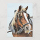 Portrait d'aquarelle numérique réalisé à partir d'une photo d'un cheval de trait de châtaignier français à crinière de lin et blaze blanc, hitché, en attente et prêt à partir, en harnais avec un col, des traces et un bracelet décoré.
