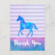 Un remerciement vous carte postale avec un joli cheval d'aquarelle dans des couleurs bleues et pourpres. Sauvage et libre courants. Placez sur un arrière - plan rayé pourpre avec un talent vintage. Une frontière bleue et rose d'aquarelle a posé à travers le fond. Merci écrit dans une police à la mode de typographie. La partie vous remercient que le message est sur le dos et peut être customisé pour adapter à vos buts, ou est parti comme est.