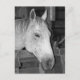Photo en noir et blanc d'un cheval gris debout dans une grange de l'Oklahoma