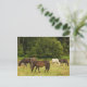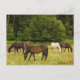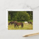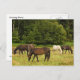 Cette carte postale présente des chevaux bruns et blancs broutant dans la haute herbe d'un champ doré par une chaude journée d'été.