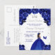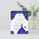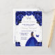 Cette invitation d'anniversaire élégante et glamour pour un sweet sixteen présente une belle princesse aux cheveux bruns dans une robe de bal bleu foncé. Le texte combine une écriture manuscrite et des polices sans serif modernes pour un look classe et sophistiqué. Les arrangements floraux, le papillon et les confettis argentés créent le mélange parfait de rustique et de chic.