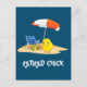 Chick à la retraite, oh si mignon, à la plage avec son transat et son parasol coloré.