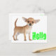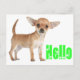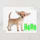 Aww...Qui peut résister au visage doux d'un chiot Chihuahua ? Cette carte postale amusante présente l'image d'un chiot Chihuahua aux oreilles géantes surligné contre un arrière - plan blanc croustillant avec un bonjour vert citron saluant dans une police de coeur mignonne. Les cartes postales Hello sont une alternative économique aux cartes de voeux de taille réelle lorsque vous voulez envoyer une note rapide. Bonjour Cartes postales sont super pour... Notes personnelles Organisations liées au chien Correspondance d'affaires Enceintes cadeaux avec messages spéciaux Invitations de parties Annonces - nouveau domicile, entreprise, mariage, graduation Enregistrer la date Cartes sourires à la famille, amis et clients. Quelques cadeaux et produits Chihuahua que vous pouvez aimer.... com Tags : Merci, vous manquez, pensant à vous, amis, bonjour, amour, félicitations, désolé, allons ensemble, bonjour, bien bientôt,