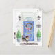 Annoncez votre nouvelle adresse avec notre faire-part élégante avec un Chihuahua aux cheveux longs, une porte d'entrée bleue, un tapis de bienvenue, une ardoise, des topiaires et une couronne fleurie posée sur un arrière - plan en brique grise.