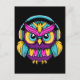 hibou rétro super multicolore portant un casque. Cette chouette de bande dessinée a des plumes vives et colorées en rose, bleu, jaune, turquoise et violet. Il porte un ensemble de casques funky modernes en jaune et bleu.