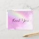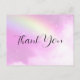 Carte postale Merci avec un bel arrière - plan. Un ciel rose pastel avec des nuages moelleux et un arc-en-ciel couleur citron. Design magique et fantaisiste.