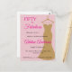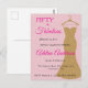 Cinquante ans et fabuleux script minimal rose, or et noir moderne carte d'invitation pour votre 50e anniversaire que vous pouvez personnaliser et envoyer pour votre fête d'anniversaire. Les mots "Cinquante ans et Fabuleux" sont sur un fond rose, avec une typographie de police de caractères rose chaud populaire, placés à côté d'une élégante robe du soir dorée sans bretelles sophistiquée.