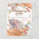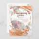 Une carte postale de Thanksgiving Dinner Invitation avec un cadre d'aquarelle élégant aux couleurs automnales avec une couronne de feuilles, une chaise et une couverture douillette aux côtés des citrouilles, des pommes et des baies. Thanksgiving Dinner est organisé dans une élégante typographie de script en deux tons et le reste du texte est facilement personnalisé avec vos propres détails de fête.
