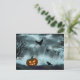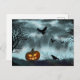 Design d'Halloween dynamique avec un citrouille brillant avec des yeux et des dents brillants dans un paysage sombre avec des arbres et des corbeaux.