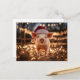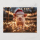Carte postale avec un adorable cochon portant un chapeau de Père Noël et entouré de lumières scintillantes.