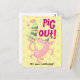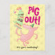 Un cochon heureux sur une carte postale d'anniversaire. Utilisez "Personnaliser ce modèle" pour modifier le texte "PIG OUT ! C'est votre anniversaire !" et créer un message unique et personnalisé. Une carte présentant un cochon joyeux, sous un gâteau à étages bancal avec des rubans de glaçage vert et surmonté de bougies roses.