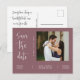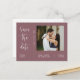 Cette carte postale de faire-part de fiançailles "save the date" présente une calligraphie élégante et une police de caractères sans empattement simple sur un fond violet poussiéreux avec une photo et un code QR pour un look minimaliste et moderne, ce qui est une belle façon d'informer de votre mariage imminent. La simplicité de ce design ajoute une touche d'élégance à vos cartes d'invitation "save the date" de mariage. Cela fonctionne bien avec de nombreux thèmes de mariage et constitue certainement un excellent ajout à votre mariage. Il suffit de personnaliser les noms et le texte en quelques étapes faciles et de personnaliser la carte postale d'invitation avec votre photo du couple heureux et de remplacer le code QR au dos par le vôtre pour donner à votre carte postale une belle touche personnelle.