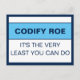 Codify Roe C'est le minimum que vous puissiez faire.Codifying Roe devrait être le plancher des droits des femmes en matière de soins de santé, pas le plafond. Et maintenant, même cela n'existe pas. Dites au Congrès qu'il est temps qu'ils fassent le moins possible pour la santé, la sécurité et l'égalité des femmes, parce que les femmes sont des personnes, et que l'avortement, quelle que soit la raison, est la santé. Description du design : L'espace design est un arrière - plan blanc avec une bordure bleu foncé. Dans la partie supérieure de l'espace design, les mots "Codify Roe" dans une police sans serif bleu foncé. En dessous, une large bande bleue claire avec des bordures de dessus et de fond bleu foncé assorties. Sous la bande, dans la moitié inférieure du design, les mots "C'est le moins que l'on puisse faire" sur deux lignes.