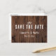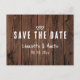 Carte postale personnalisée de mariage rustique enregistrer la date avec deux coeurs sur un fond de bois de grange. Personnalisez facilement cette carte postale de mariage à texture de bois rustique avec vos détails de mariage.