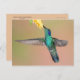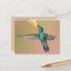Carte postale avec un bel colibri vert violet-oreille volant vers une fleur jaune dans une forêt nuageuse. Photo prise à Tandayapa, Equateur.
