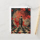 Un homme en costume porte une mallette dans une scène surréaliste avec un sol à damiers noir et blanc et des roses rouges flottantes
