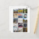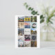 Cette carte postale est un collage d'images de voyage, comme des valises, des passeports, des flèches, des chemins, des globes et des boussoles.