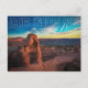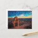 Sunset at Arches National Park, Eastern Utah Postcard : Le coucher du soleil illumine le ciel avec des nuances bleues, jaunes et violettes foncées et rouges sur le magnifique Parc National des Arches dans l'est de l'Utah, avec l'emblématique Arc de grès Delicate au premier plan.