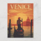 Une affiche romantique de voyage de style vintage capturant un moment de tranquillité à Venise, Italie. L'illustration montre un gondolier dirigeant son bateau sur le Grand Canal au coucher du soleil. La ligne d'horizon vénitienne classique, dont le dôme emblématique de Père Noël Maria della Salute, est encadrée par un ciel chaud et orangé et le soleil brillant. Ce design rétro est parfait pour ceux qui aiment les destinations romantiques, la culture italienne et l'art de voyage classique. Il évoque un sens de l'élégance intemporelle et fait une belle pièce de décoration.