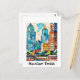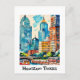 Un tableau d'aquarelle animé de la ligne d'horizon de Houston, avec des gratte-ciel emblématiques comme la tour JPMorgan Chase Tower et le Wells Fargo Plaza. Le paysage urbain est encadré par une large avenue bordée d'arbres luxuriants, créant un sentiment de grandeur urbaine et de beauté naturelle. Le ciel est bleu clair avec des nuages blancs et moelleux, ajoutant au sentiment général d'optimisme et d'énergie.