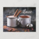 Cette carte postale offre un cadre rustique avec une tasse de thé et un couple de chocolat chaud à Love. *