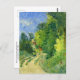 Une carte postale d'art avec la peinture de l'artiste français Paul Cézanne (1839–1906), intitulée - Courbe de la route à travers la forêt (vers 1873–1875), représente un paysage pittoresque avec une route de terre sinueuse encadrée par des arbres verts luxuriants.