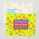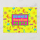 Carte postale d'invitation de fête d'été aux couleurs vives et tropicales. L'impression estivale contient des tongs, des lunettes de soleil, des palmiers et des coquillages. Le texte "fête d'été" sur le devant est un modèle. À l'arrière, incluez un paragraphe avec les informations de la fête imprimées en gras bleu aqua. Utilisez-le pour un barbecue de fin d'année, une soirée de billard ou un autre rassemblement pour enfants.