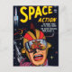 Livre de bande dessinée de science-fiction "Space Action" vintage cool de 1952 avec un astronaute de style rétro drôle tenant un pistolet laser et ayant l'air choqué tandis que le monstre alien souriant essaie d'enlever l'héroïne sans défense pour son propre plaisir.