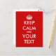 Carte postale entièrement personnalisable "Keep Calm and Carry On" basée sur l'affiche 2ÈME GUERRE MONDIALE britannique ! Vous pouvez facilement modifier le texte en entrant le vôtre dans les champs de texte, et choisissez votre couleur préférée pour l'arrière - plan ! Vous pouvez même ajouter vos propres images ou modifier l'image de la couronne existante. Soyez créatif et express vous-même ! : -)