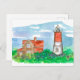 Une carte postale avec le phare de Nauset à Cape Cod, Massachusetts au toit rouge vif et fleurs sauvages violets à roulettes illustrés d'encre et d'aquarelle.