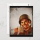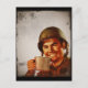 Image vintage d'un soldat souriant portant un casque et tenant une tasse en étain pleine de café dans sa main.
