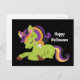 Carte postale avec l'image d'une licorne Frankenstein. Couleurs violettes et vertes. Éffrayant mignon.