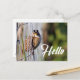 A cute bird hello postcard. beautiful nature and animals. green refreshed sunny day.