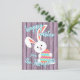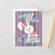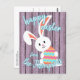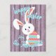 Jolie, tendance et moderne "Happy Easter" police de caractères sur un ressort violet clair perwinkle planches en bois violet à l'air arrière - plan et un lapin lapin mignon au-dessus des planches. Avec de la place pour facilement customiser ou personnaliser avec votre nom de famille et le texte de votre choix sur le devant, et un poème ou un mignon message de salutation personnel sur le côté arrière.