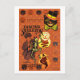 Un garçon vintage jouant avec le squelette d'Halloween. Chat noir portant le chapeau en haut. Sorcière. Bordure de chat noir et citrouille "Jack-o'-lantern".