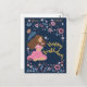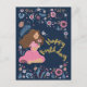 Carte d'anniversaire bleue avec une dame entourée de fleurs.