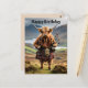 Illustrée avec des vues sur les Highlands écossais, une vache des Highlands drôle debout avec un kilt et portant ses cornemuses.