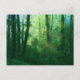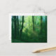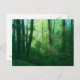 Les rayons du soleil matinal se répandent dans une forêt estivale d'une verdure éclatante, avec des arbres massifs recouverts de lierre et une épaisse couverture de sous-bois. Une photographie numériquement manipulée pour donner aux feuilles de la vigne, de la brume bleu-vert, des rayons dorés et des arbres verts printaniers une qualité de rêve.