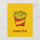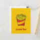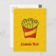 Illustration de dessin animé d'un petit paquet de frites. Icônes de contour de malbouffe sur fond à motif jaune. Texte personnalisé.