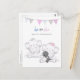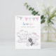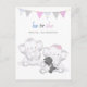 Un design moderne adorable avec deux bébés éléphants avec une bannière grise/rose et bleue en haut où "il ou elle sera notre arachide?" est intitulé. A l'envers, nos modèles d'invitation, la verdure et la baguette avec des bulles qui coulent. Fille éléphante tenant un chien noir.