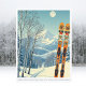 Bonjour des montagnes enneigées de Loon Mountain, dans le New Hampshire ! Nous espérons que vous passez des vacances de ski merveilleuses. Cette carte postale présente un magnifique paysage montagneux gris-bleu avec des planches de ski rétro dans un motif tribal orange.
