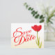 Belle tulipe rouge unique et lumineuse sur fond de couleur crème rustique, invitation de mariage 'save the date' informelle. Personnalisez cette invitation avec vos propres mots. Invitation simple, moderne et romantique, idéale pour un mariage printanier ou à thème de fleurs de tulipes. Conception et peinture de tulipe à l'aquarelle par Sarah Trett.
